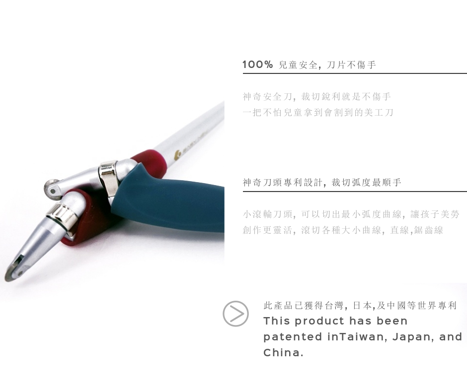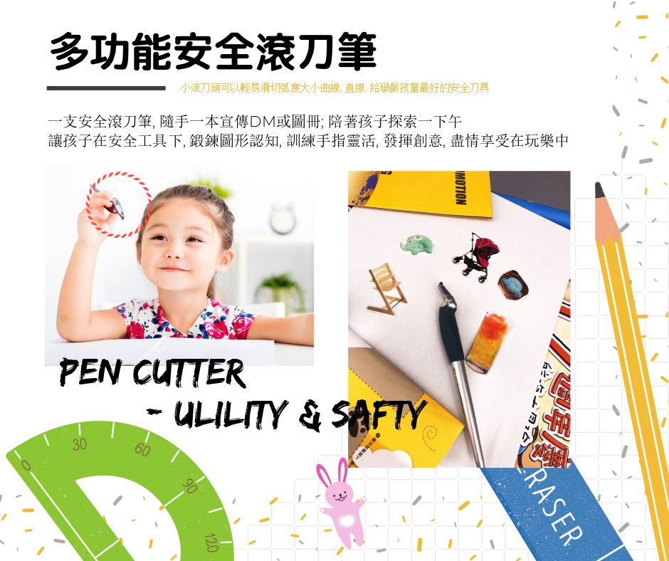 安全滾刀筆_學齡前孩童, 最安全的美勞工具; 父母最放心的陪伴夥伴 一隻滾刀筆, 加上各種超商宣傳/周年慶型錄, DM, 隨手一本圖冊 讓媽媽在家就可以輕鬆開啟一堂, 手指訓練的課程, 創造一堂CP值最高的下午茶親子時光 安全滾刀筆特色 精緻切割: 界最小滾輪刀頭, 易切小彎曲, 對圓弧曲線小手也能掌握 兒童安全: 神祈安全刀, 可以切紙, 就是永不切手 專利設計: 人體 學專攻, 握把上有可以扭轉的矽膠護套設計, 讓手指切割不痛好用, 也可扭轉適合自己的手型 高硬度鎢鋼: 鎢鋼刀頭, 超耐, 免換刀頭 施做材質 紙張, 宣紙, 氣泡袋, 塑膠布等等; 紙張厚度建議在150磅以內 (約等於兩張影印紙唷) 使用裁切時後, 鎢鋼刀頭在硬質底層下能發揮最佳效用; 購買此產品都會贈送一份墊板, 也可 用金屬板, 磁磚當墊底 產品使用警告: 鎢鋼鋼頭對硬質材質容易切割, 在軟墊上就無法成線切割功效; 此產品嚴禁在玻璃上切割, 也勿用玻璃當墊底