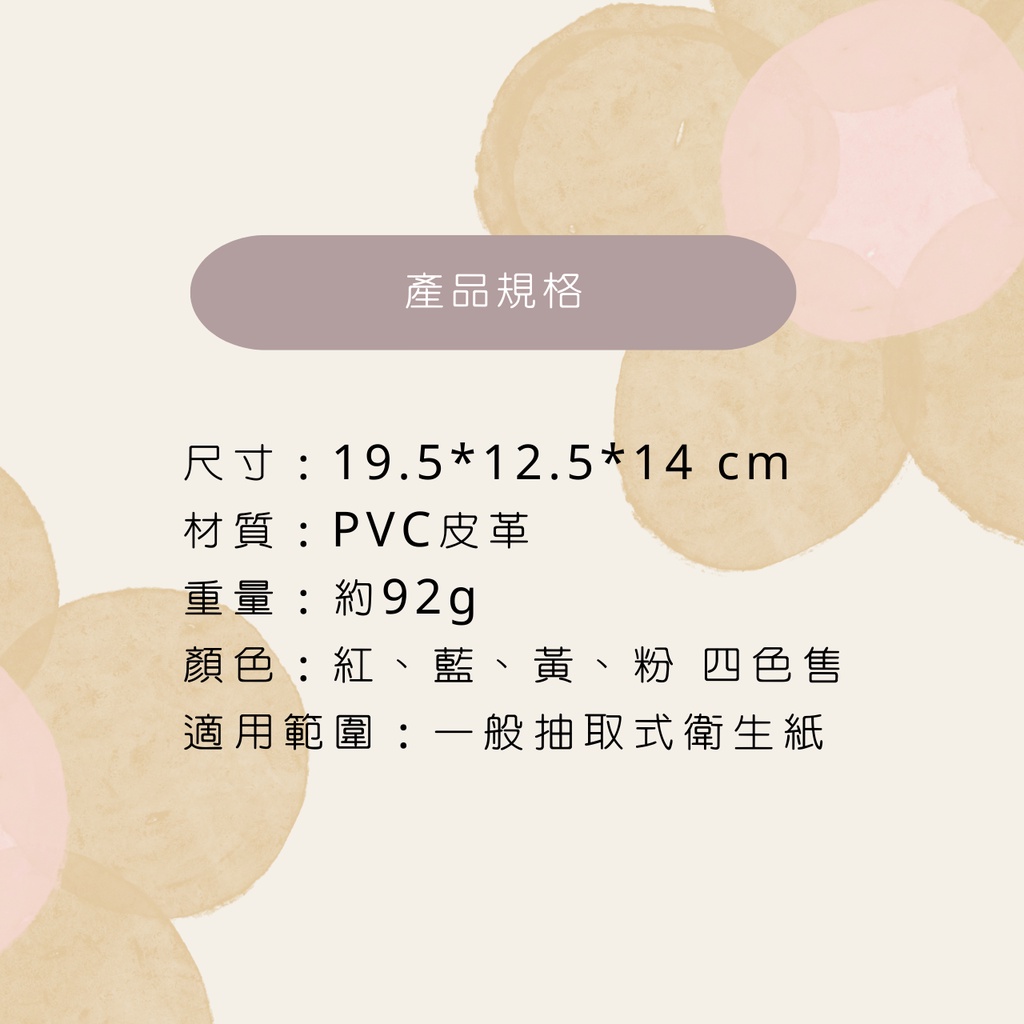 北歐風皮革面紙盒套 / 衛生紙盒套 / 抽取式衛生紙套 車用面紙盒 簡約設計搭配性高 適用於各種空間 皮革質感層次分明 有效防水 多種顏色搭配不同風格 商品介紹 復古皮革字母壓印,高品味古銅色銅扣經久耐用,抽取方便,柔軟舒適 【商品說明】 尺寸:19.5*12.5*14 cm 材質:PVC皮革 重量:約92g 顏色:紅、藍、黃、粉 四色售 適用範圍:一般抽取式衛生紙