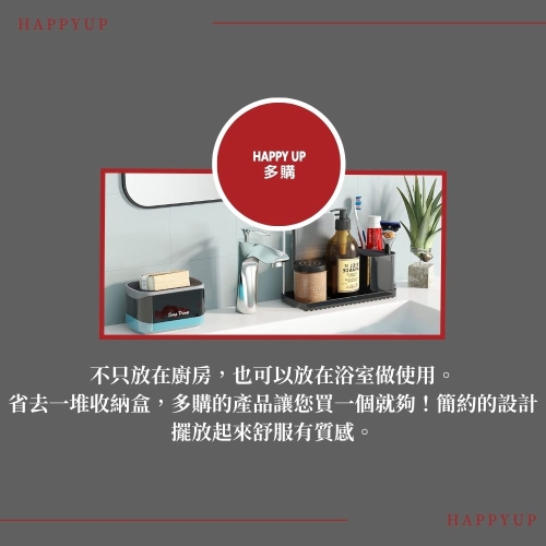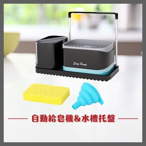 產品描述:自動給皂機控制用量、節省多餘的浪費;廚房水槽盒可放置洗滌器、海綿、刷子、洗碗布等等;